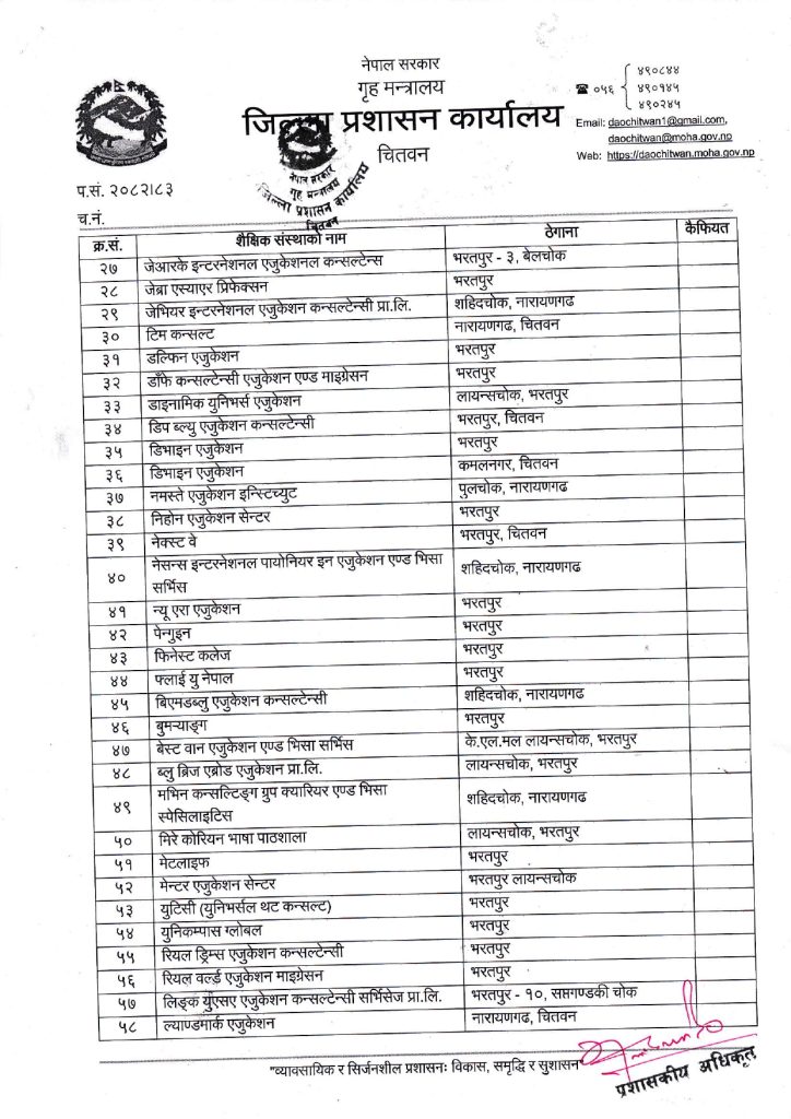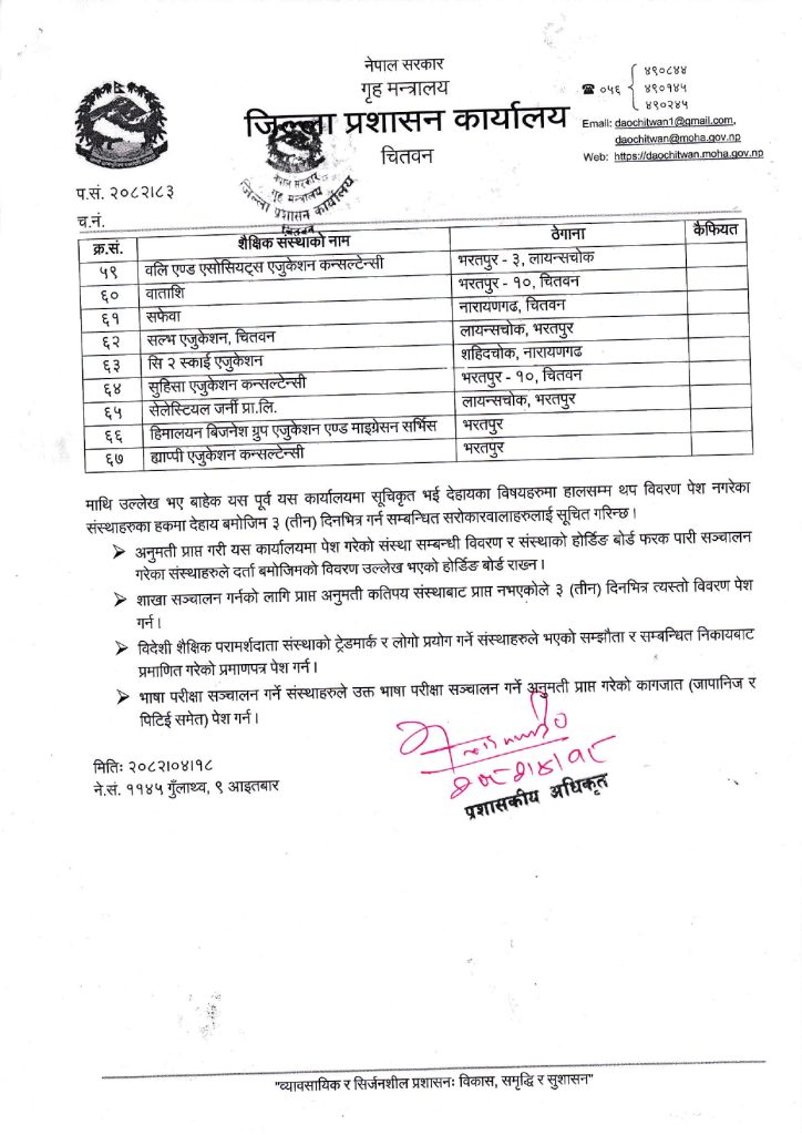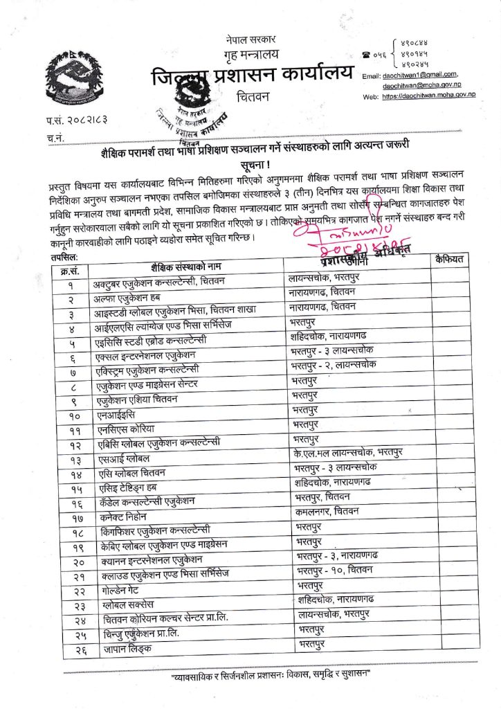 चितवन जिल्लामा शैक्षिक परामर्श तथा भाषा प्रशिक्षण कक्षा सञ्चालन गर्दै आएका ६७ संस्थालाई जिल्ला प्रशासन कार्यालय, चितवनले तीन दिनभित्र अनुमति प्रमाणपत्र पेश गर्न सूचना जारी गरेको छ। गृह मन्त्रालयको निर्देशनअनुसार, यस्ता परामर्श तथा भाषा तालिम केन्द्रहरूले शिक्षा, सामाजिक विकास मन्त्रालय वा सम्बन्धित नियामक निकायबाट प्राप्त अनुमति तथा दर्ता प्रमाणपत्रसहितका कागजातहरू पेश गर्नुपर्ने सूचनामा उल्लेख छ।
